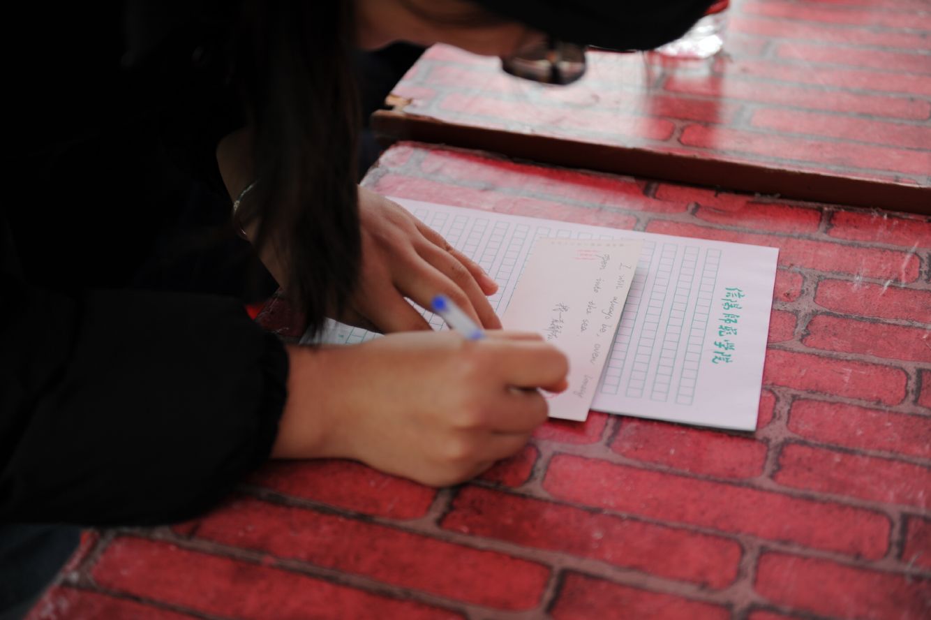 11月28日,太阳成集团tyc539中外文化交流协会在八餐小广场举办“双语寄相思”活动。此次活动让每一个参赛者分享亲人的柔情思念,通过中英或中韩双语的表达形式,让一封双语家书承载着同学们的思念飞向远方,让家的温情在字里行间沉淀流转。