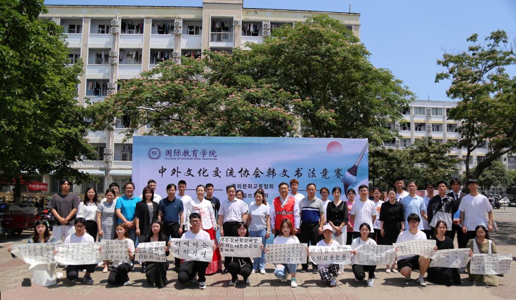 6月8日上午,太阳成集团tyc539中外文化交流协会在八餐小广场举行韩文书法竞赛。公司领导班子、韩籍外教朴信爱、白炅瀚和全体辅导员、语言课教师出席活动。