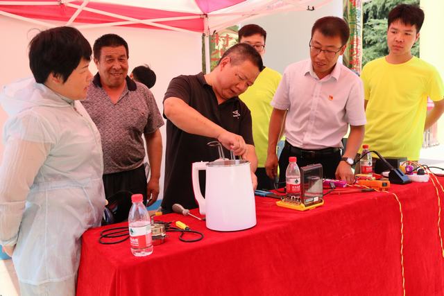 实践小分队在绿之风李芳希望小学街边,开展为当地居民电器义务维修的活动。当日前来修电器的村民络绎不绝,志愿者们在于大庆老师的帮助下,用携带的工具,展开了服务活动,志愿者们不顾汗水的洗礼,全身心的投入到维修当中。