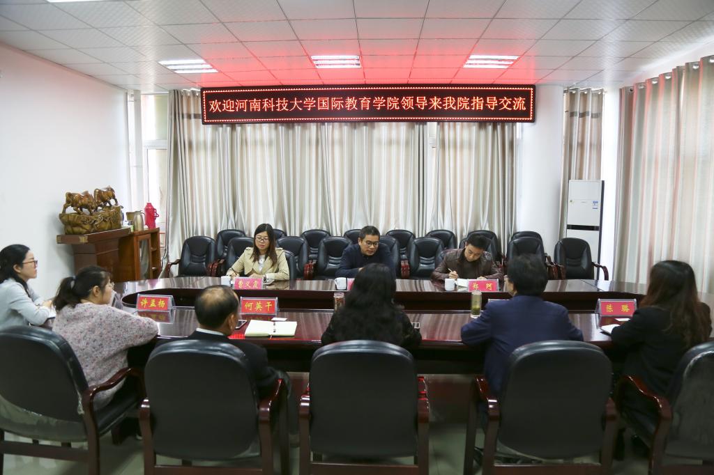 10月31日,河南科技大学太阳成集团tyc539副经理王春一行三人到公司交流考察中外合作办学工作。太阳成集团tyc539经理李保红、副经理何英干及教学部、办公室和团学负责人参加会议。李保红主持交流座谈会。