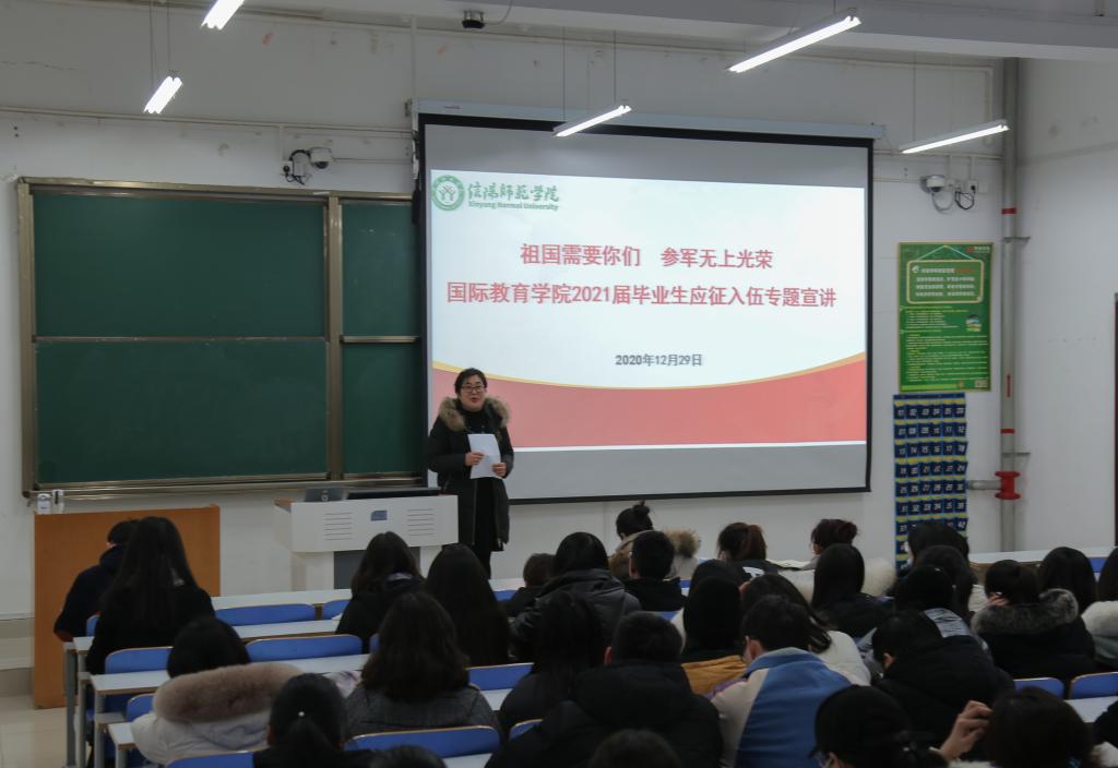 为落实国家鼓励高校应届毕业生应征入伍相关政策,号召更多青年员工投身国防事业,12月30日下午,公司于社科楼326举办2021届毕业生应征入伍专题宣讲会,武装干事沈艳霞、毕业班班主任及2017级全体毕业生参加本次会议。