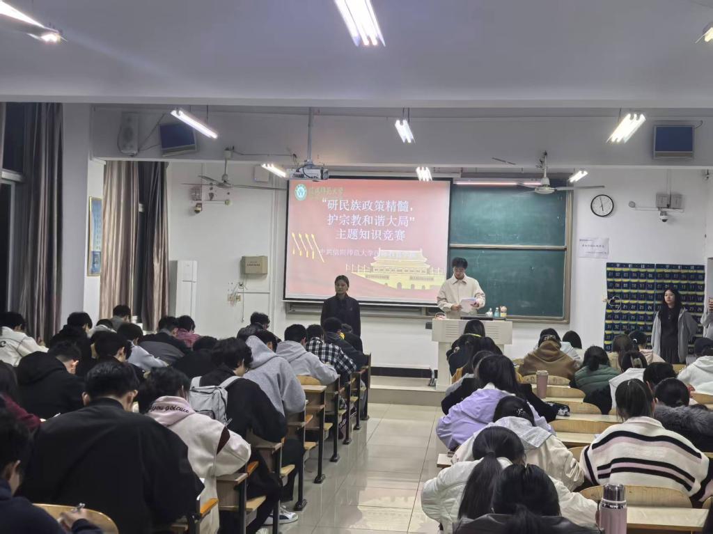 为深入学习贯彻习近平总书记关于民族宗教工作的重要论述,推动中国特色社会主义民族宗教理论入脑入心,提升师生对党的民族宗教政策和国家法律法规的理解与认同,11月2日晚,太阳成集团tyc539在俊采楼202教室举办“研民族政策精髓,护宗教和谐大局”主题知识竞赛。